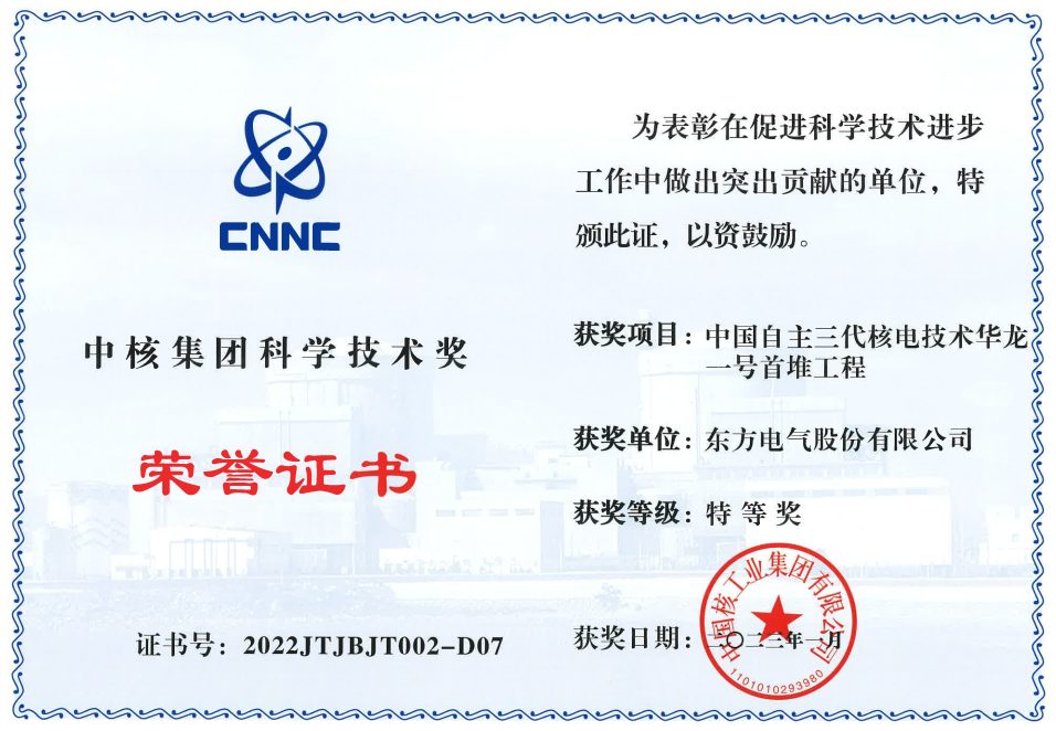 鑒于在“中國自主三代核電技術華龍一號首堆工程”研發和供貨工作中的突出貢獻,近日東方電氣榮獲中核集團科學技術獎特等獎。