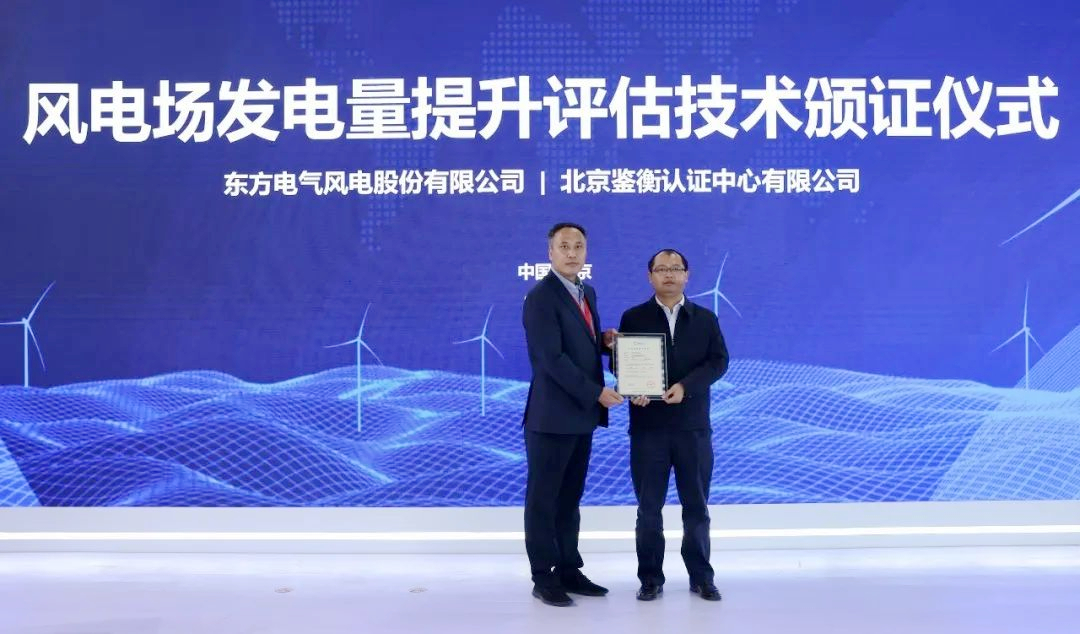 北京鑒衡認證中心向東方風電頒發《風電場發電量提升評估技術》認證證書。由東方風電完全自主研發的風電場發電量提升評估技術,解決了風速變化下的應發電量核算難題。通過應發電量和實際發電量對比分析,可實時掌握風場電量損失、增益等情況,從而評估整個風電場的發電性能情況。經鑒衡理論評估及可行性驗證,這項技術已經成為行業首個可操作、可量化、可計算的電量提升評估方法,促進了風電行業服務的轉型升級。目前,該技術已授權發明專利1項,發布團體標準1項,進一步實現電量提升計算有標可依。