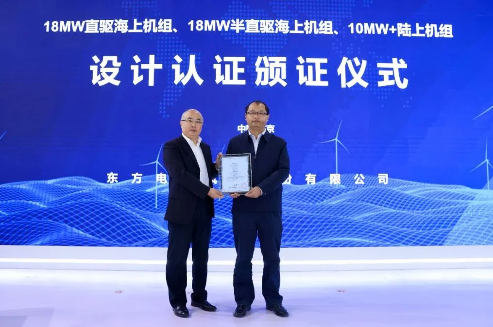 10月17日,在2023年北京國際風能大會暨展覽會上,東方電氣風電股份有限公司正式發布了18MW直驅海上風電機組、18MW半直驅海上風電機組、10MW+陸上風電機組三款新產品,這三款機型是東方風電適應我國風電大型化、平價化發展需求最新開發的旗艦產品。展會上,東方電氣風電股份有限公司組織開展了相關專題技術交流,三款新產品同時獲得中國質量認證中心頒發的設計認證證書。