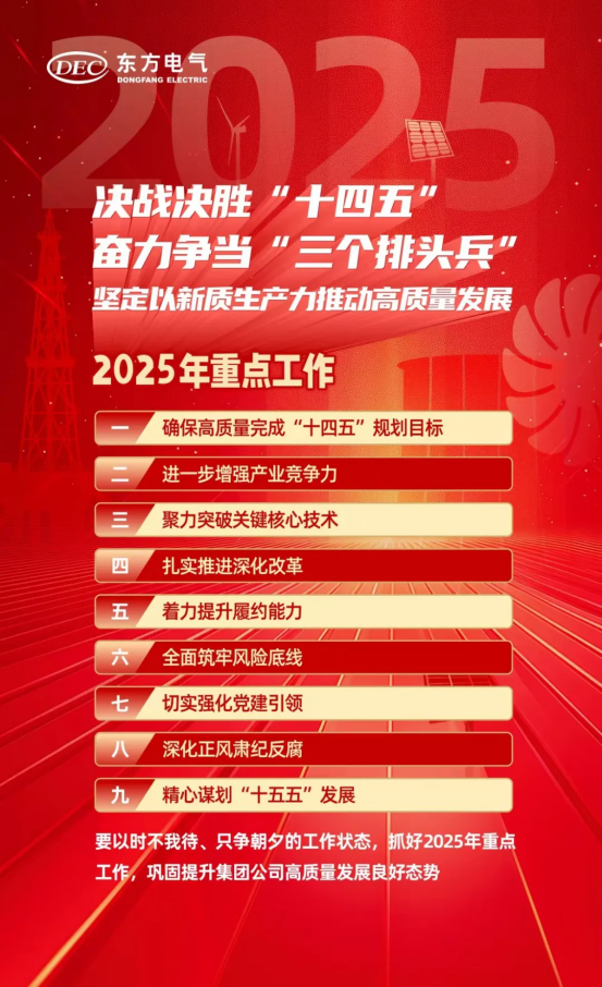1月17日,東方電氣集團(tuán)召開(kāi)2025年度工作會(huì)議。會(huì)議以習(xí)近平新時(shí)代中國(guó)特色社會(huì)主義思想為指導(dǎo),全面貫徹黨的二十大和二十屆二中、三中全會(huì)精神,認(rèn)真落實(shí)中央經(jīng)濟(jì)工作會(huì)議決策部署和中央企業(yè)負(fù)責(zé)人會(huì)議工作要求,全面總結(jié)集團(tuán)公司2024年各項(xiàng)工作,系統(tǒng)部署2025年重點(diǎn)工作,動(dòng)員全體干部職工持續(xù)落實(shí)“領(lǐng)先戰(zhàn)略”和“11256”發(fā)展戰(zhàn)略,加快建設(shè)具有核心競(jìng)爭(zhēng)力的世界一流裝備制造集團(tuán)。