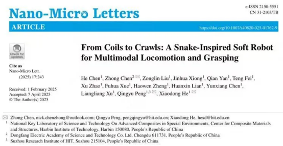 相關成果以《From Coils to Crawls: A Snake-Inspired Soft Robot for Multimodal Locomotion and Grasping》為題,東方研究院陳仲博士與哈爾濱工業(yè)大學赫曉東院士、彭慶宇教授為共同通訊作者。