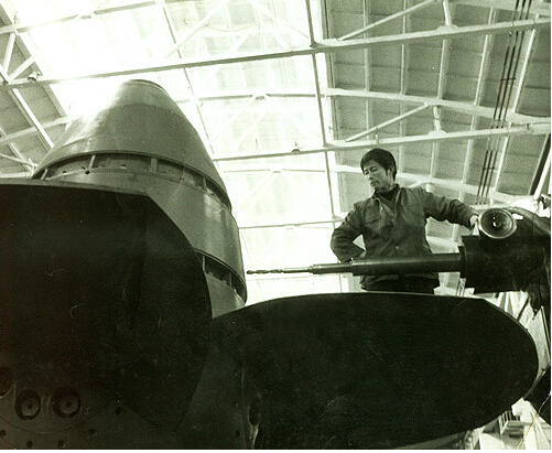 除了這臺固定的舊鉆床外,汪煥木和他的徒弟還有一臺同樣大的可移式萬能鉆床,這在全分廠沒有第二例。開萬能鉆,就要“轉戰四方”,從廠房這頭到廠房那頭,從大電機廠房到重跨廠房,哪里有需要,汪煥木就要干到哪里.到處“轉戰”,來來去去,費時費力。而這時往往又需要爬到七八米高的工件上面去干,危險性大,不好站位,別人不愿干,汪煥木一聽,拿著工具就去干。