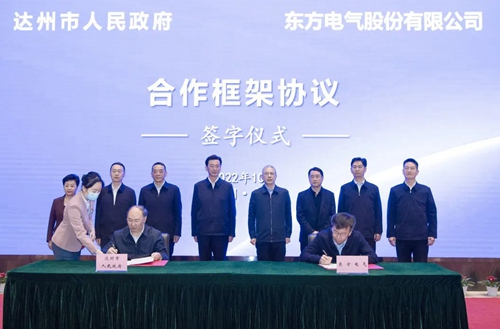 在徐鵬、邵革軍、嚴(yán)衛(wèi)東等領(lǐng)導(dǎo)見證下,東方電氣股份有限公司與達(dá)州市人民政府簽署合作框架協(xié)議。東方電氣集團(tuán)黨組成員、副總經(jīng)理李忠軍,達(dá)州市委常委、常務(wù)副市長丁應(yīng)虎代表雙方簽字。