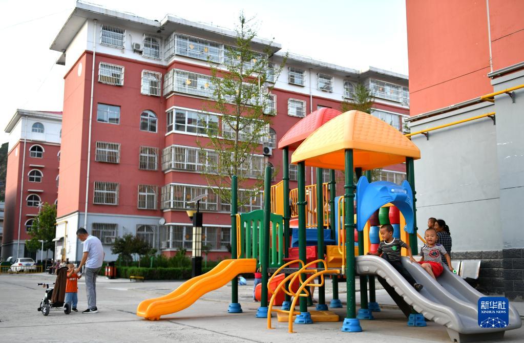 在陜西省延安市延川縣文安驛鎮梁家河小區,小朋友在滑梯上玩耍(2020年7月29日攝)。新華社記者 張博文 攝