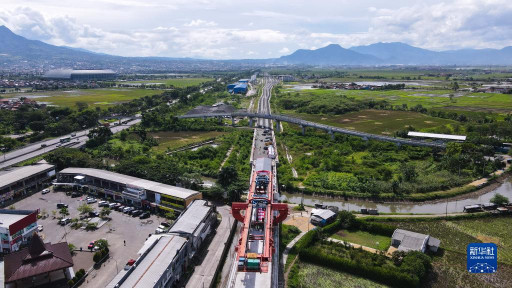 這是2022年5月25日在印度尼西亞萬隆拍攝的雅萬高鐵4號梁場萬隆方向架梁通道上最后一榀箱梁架設現場(無人機照片)。新華社記者徐欽攝