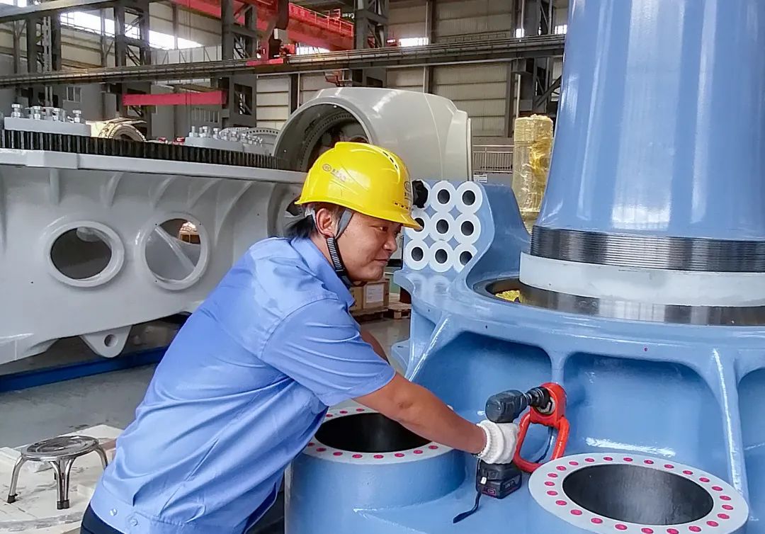 ◆東方電機水輪機分廠內,蟠龍3號機球閥軸端正在進行裝配作業