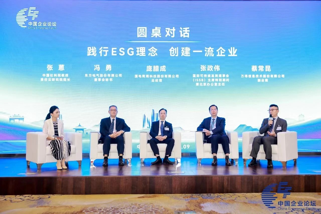 東方電氣股份有限公司董事會秘書馮勇作為10家“央企ESG·先鋒100指數”入選企業代表領取證書,并在第六屆中國企業論壇平行論壇“踐行ESG理念,創建一流企業——中央企業ESG論壇”中作圓桌分享。
