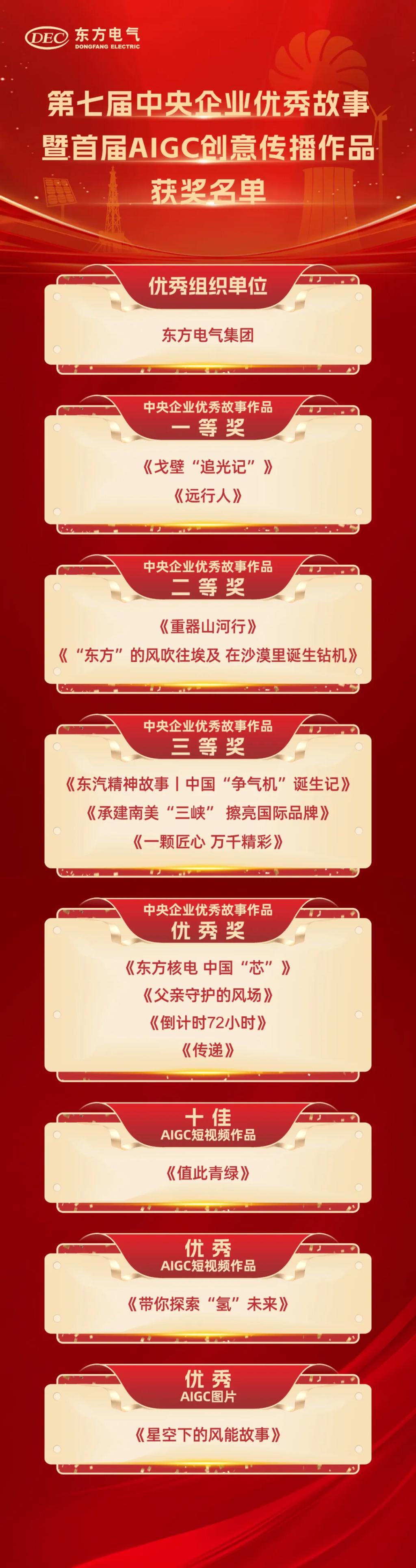 其中,《戈壁“追光記”》《遠行人》榮獲中央企業優秀故事作品一等獎,《重器山河行》《“東方”的風吹往埃及 在沙漠里誕生鉆機》榮獲中央企業優秀故事作品二等獎,《東汽精神故事丨中國“爭氣機”誕生記》《承建南美“三峽”擦亮國際品牌》《一顆匠心 萬千精彩》榮獲中央企業優秀故事作品三等獎,《東方核電 中國“芯”》《父親守護的風場》《倒計時72小時》《傳遞》榮獲中央企業優秀故事作品優秀獎,《值此青綠》獲評十佳AIGC短視頻作品,《帶你探索“氫”未來》獲評優秀AIGC短視頻作品,《星空下的風能故事》獲評優秀AIGC圖片。