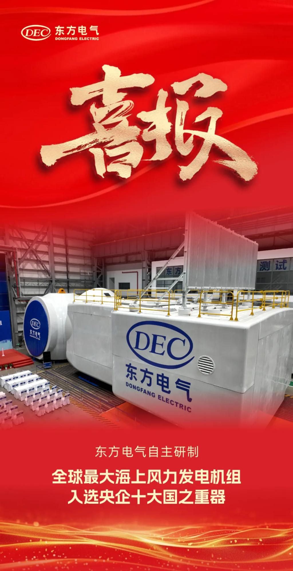 1月1日,國務院國資委新聞中心正式發布2024年度央企十大國之重器,由東方電氣研制的“全球最大海上風力發電機組”成功入選。繼“全新一代18兆瓦海上直驅風電機組”后,東方電氣海上風電產品再次入選央企十大國之重器。