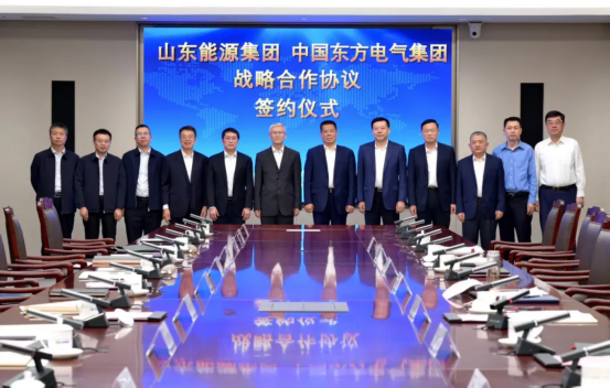 10月15日,中國東方電氣集團有限公司與山東能源集團有限公司在濟南簽署戰略合作協議。東方電氣集團總經理、黨組副書記張彥軍,山東能源集團黨委書記、董事長李偉,共同見證協議簽署。東方電氣集團黨組成員、副總經理李建華,山東能源集團黨委常委、副總經理侯宇剛代表雙方簽訂《戰略合作協議》。