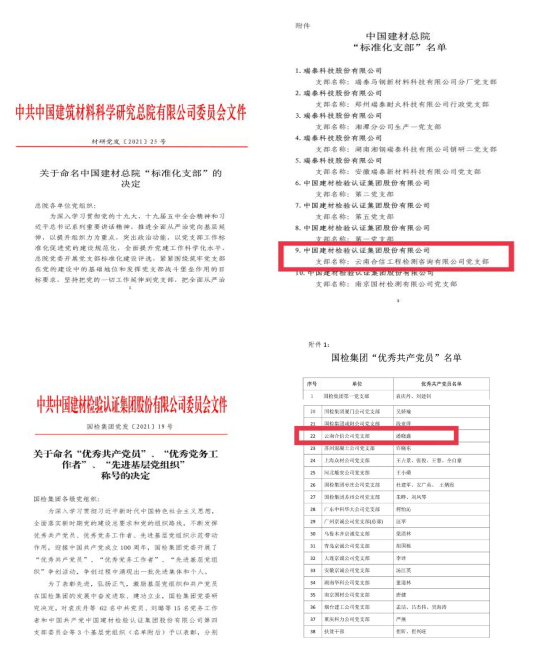 近日,根據(jù)中共中國(guó)建筑材料科學(xué)研究總院有限公司委員會(huì)印發(fā) 《關(guān)于命名中國(guó)建材總院“標(biāo)準(zhǔn)化支部”的決定》,云南合信工程檢測(cè)咨詢(xún)有限公司黨支部榮獲中國(guó)建材總院 “標(biāo)準(zhǔn)化支部”稱(chēng)號(hào),支部黨員潘曉鑫獲國(guó)檢集團(tuán)“優(yōu)秀共產(chǎn)黨員”榮譽(yù)稱(chēng)號(hào)。