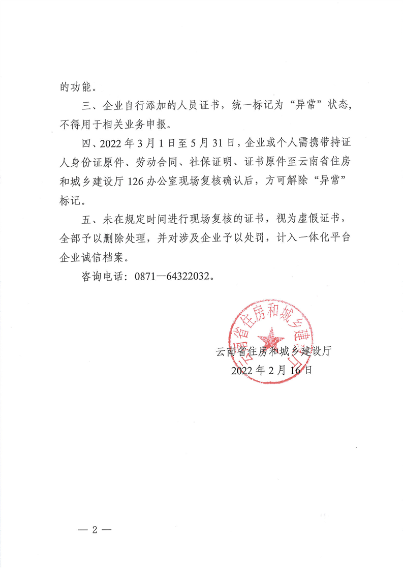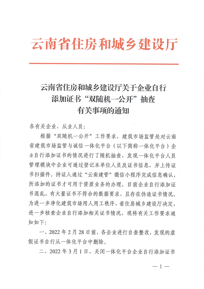 云南省住房和城鄉(xiāng)建設廳關于企業(yè)自行添加證書“雙隨機一公開”抽查有關事項的通知