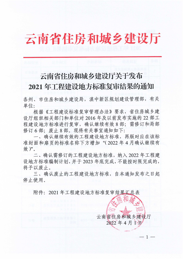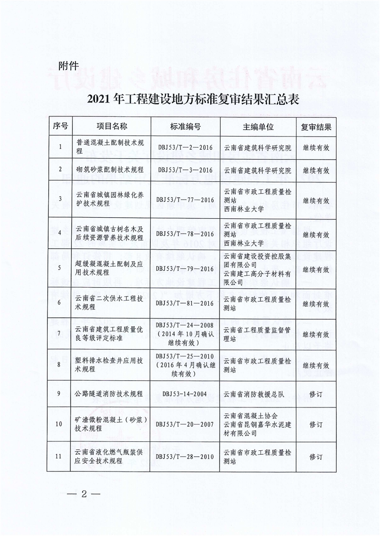 云南省住房和城鄉(xiāng)建設(shè)廳關(guān)于發(fā)布2021年工程建設(shè)地方標(biāo)準(zhǔn)復(fù)審結(jié)果的通知