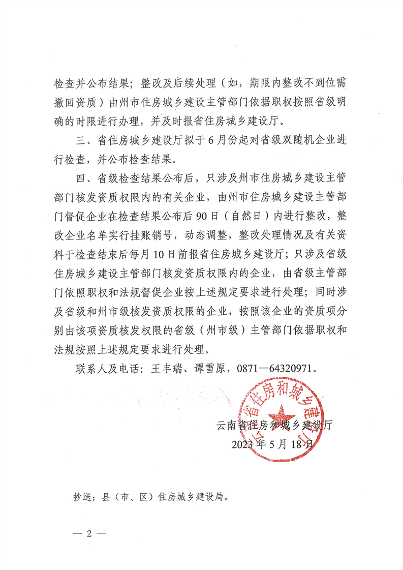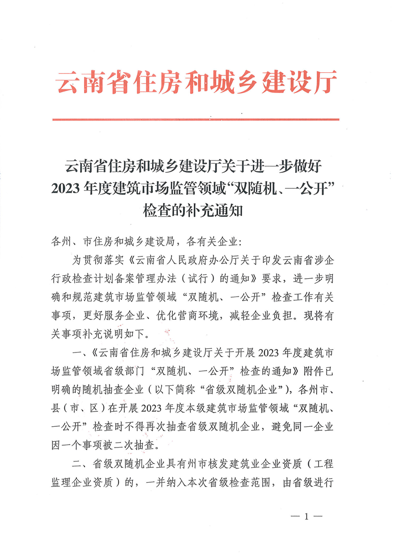 云南省住房和城鄉(xiāng)建設(shè)廳關(guān)于進(jìn)一步做好2023年度建筑市場(chǎng)監(jiān)管領(lǐng)域“雙隨機(jī)、一公開”檢查的補(bǔ)充通知