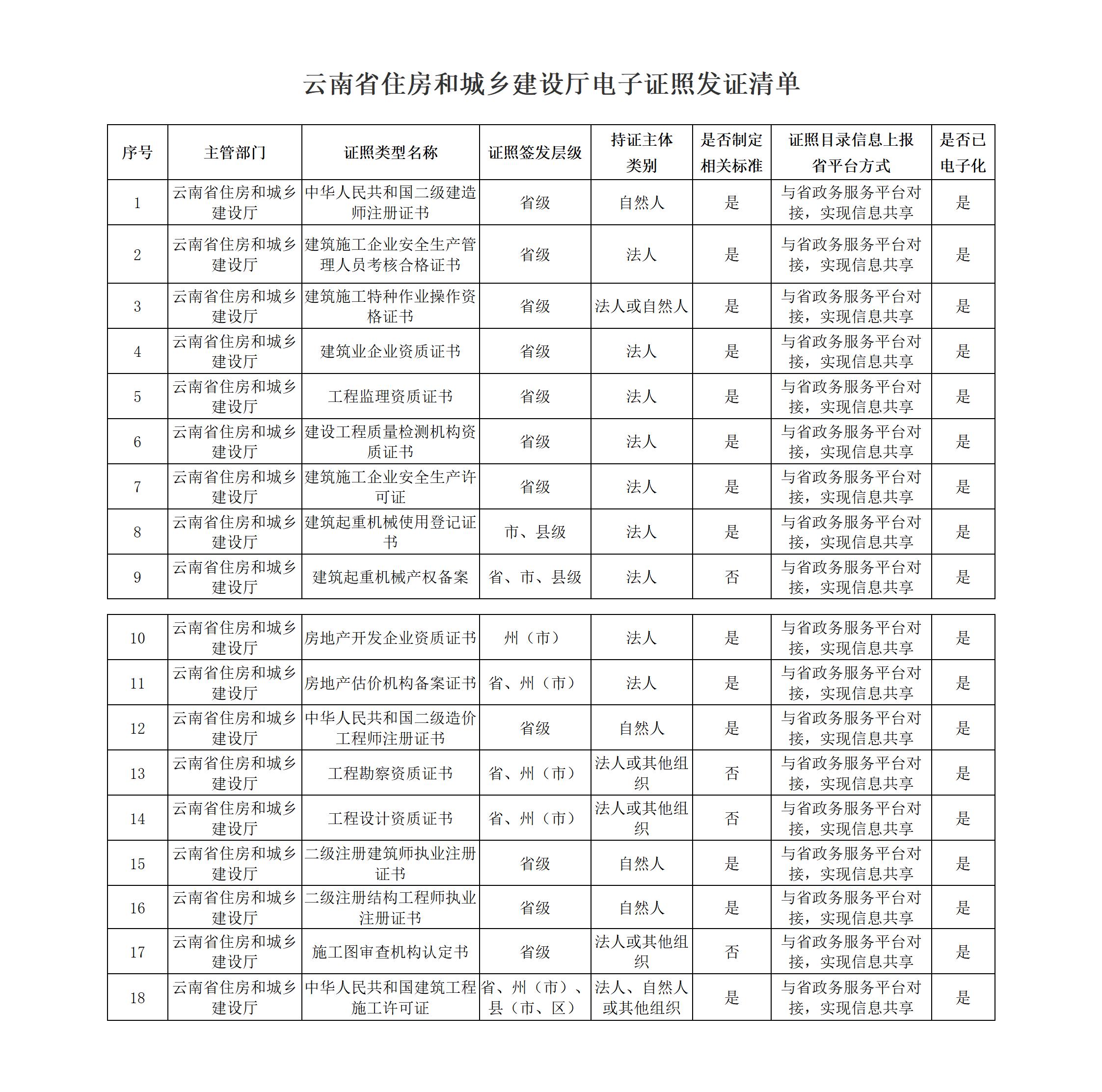 云南省住房和城鄉(xiāng)建設(shè)廳電子證照發(fā)證清單