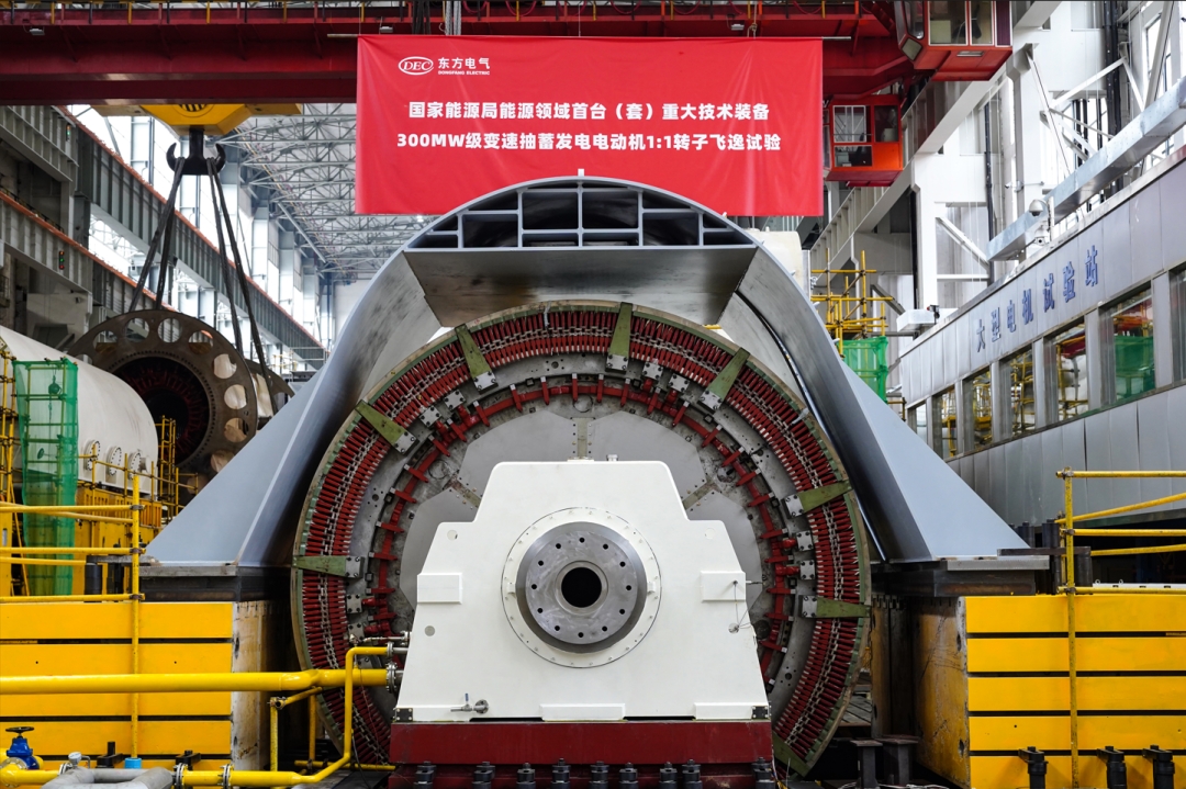 本網訊8月16日上午,國家能源局能源領域首臺(套)重大技術裝備項目——300兆瓦級變速抽水蓄能機組發電電動機1:1轉子,在東方電氣集團東方電機有限公司順利通過飛逸試驗,動態穩定性、可靠性等得到充分驗證,標志著我國變速抽水蓄能機組自主研制取得重大突破!該轉子創新采用端部整體護環固定結構,應用新型轉子繞組接線方法,開發超大直徑非...